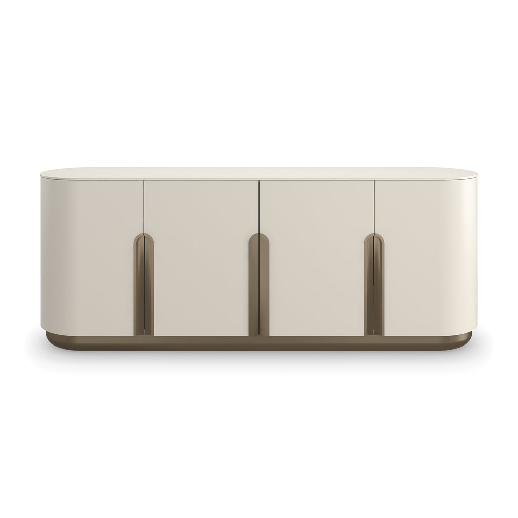 A stunning centerpiece that recalls the whitewashed architecture of the Moroccan coast, the Tangier 4-Door Sideboard from Caracole is a study in tactile design and worldly inspiration. This beautiful sideboard is defined by a series of arches formed by its unique Lucent Bronze hardware, creating a striking contrast against the textured, Burnished Adobe finish. Balanced on a sleek, metallic plinth base, its clean lines and gently rounded edges lend a versatile style perfect for dining interiors, media rooms, or home offices. A fusion of global inspiration and contemporary form, it offers chic, organized storage with a captivating presence.