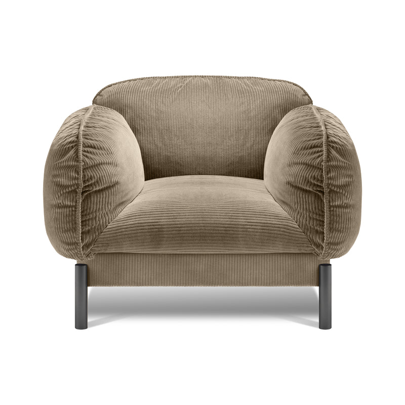 The Tarantino Lounge Armchair, designed by Lorenza Bozzoli, offers a luxurious and comfortable seating experience. The soft corduroy upholstery and generous padding envelop you in a cozy embrace, while the black cylindrical feet add a touch of elegance. Enjoy the plush seat and fully stuffed backrest and armrests, accented by subtle tone-on-tone piping.