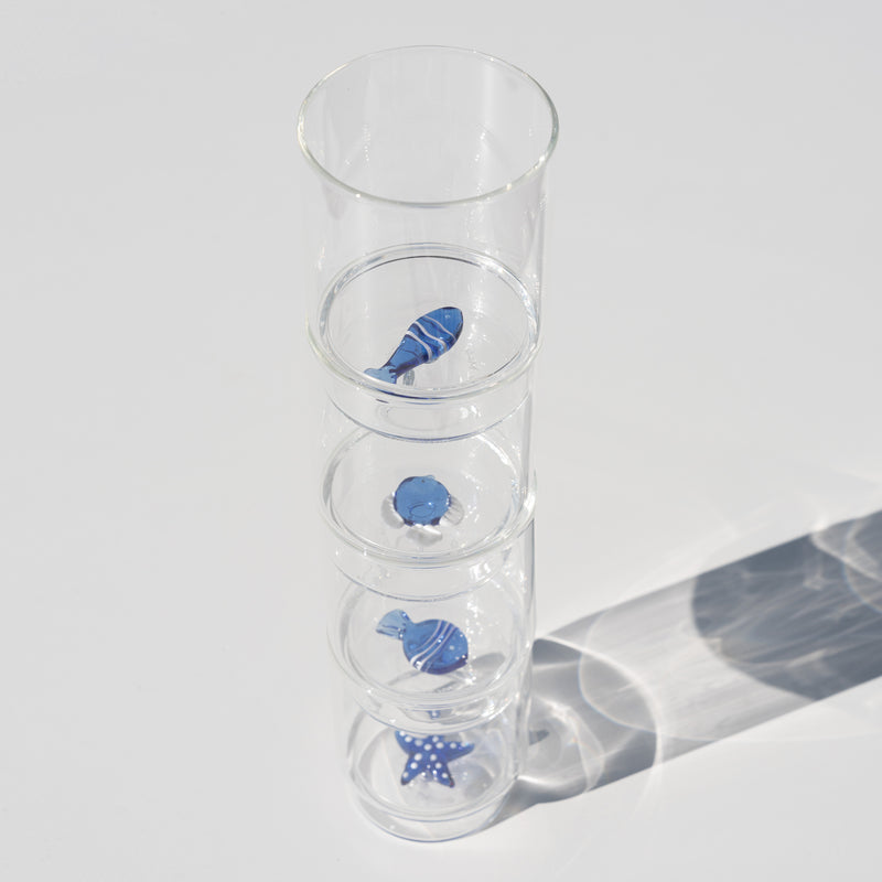 Bring the whimsical charm of the sea to your table with the Teca Mare Tumbler Set from Zafferano. Crafted in Italy from durable borosilicate glass, each tumbler features a revolutionary double-walled base. A delightful, handmade marine creature is safely suspended within, protected from the elements while allowing for easy cleaning and worry-free use with ice. With six different designs, this stackable set lets guests easily identify their glass, blending playful design with smart functionality.
