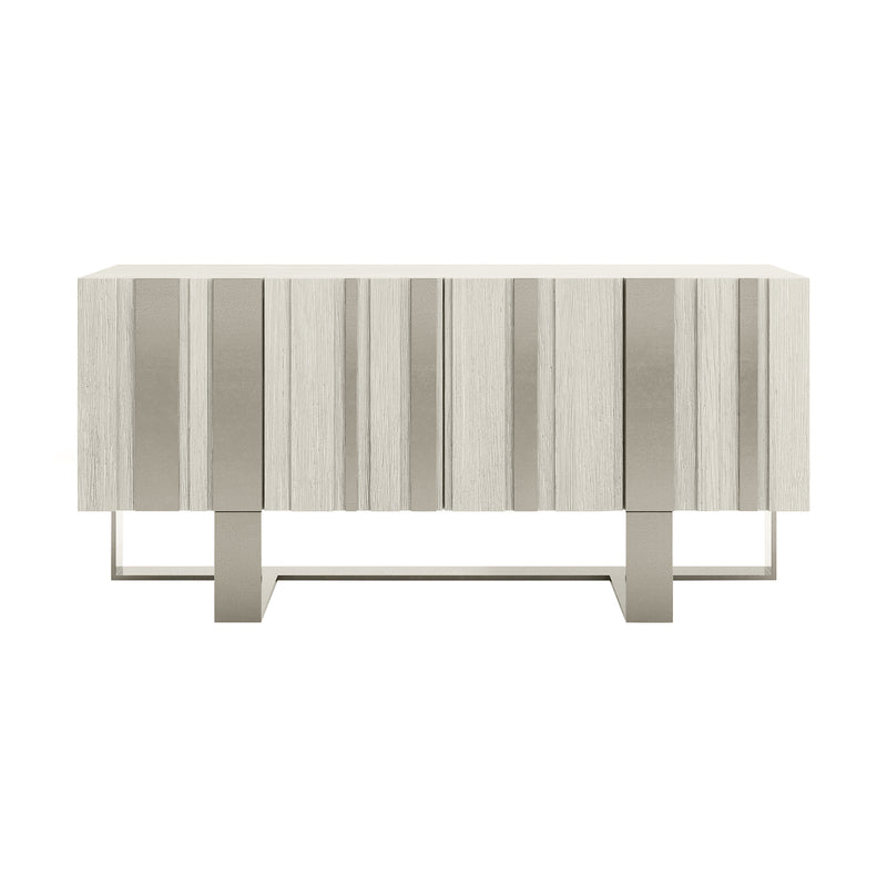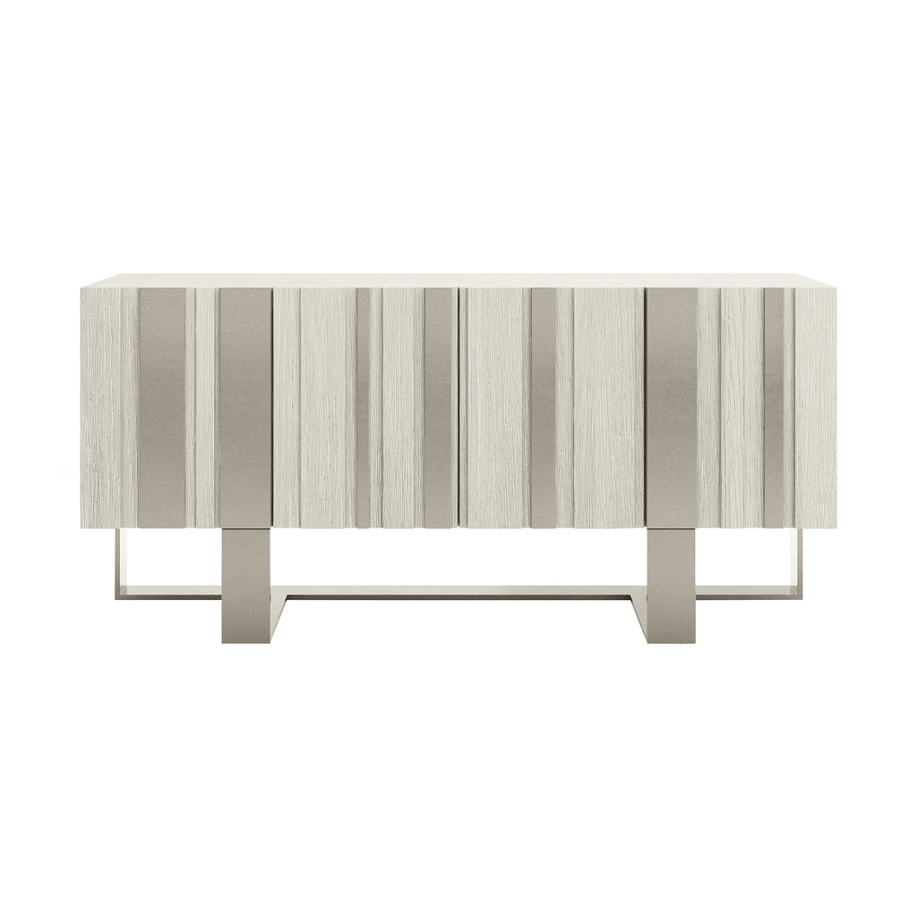 A captivating interplay of light, shadow, and texture, the Tempo Buffet from Bernhardt is a stunning statement in modern, architectural design. This sophisticated buffet features four raised-panel door fronts, each adorned with sandblasted aluminum overlays. The metal rests on a background of wirebrushed oak, creating a rich, multi-layered effect. The doors open with a simple push, revealing a spacious interior. A fusion of bold materials and refined craftsmanship, it’s a sculptural and functional centerpiece for any contemporary space.