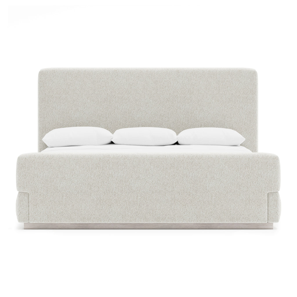 With its unique, modern architectural look, the Tempo Panel Bed from Bernhardt is a stunning statement in sophisticated design. This elegant upholstered bed is defined by a beautiful, pleated envelope fold that graces both the headboard and footboard. The footboard interlocks directly into the wirebrushed oak plinth base, creating a seamless and sculptural form. Upholstered in a durable performance fabric, it’s a beautifully crafted centerpiece for a modern, serene sanctuary.