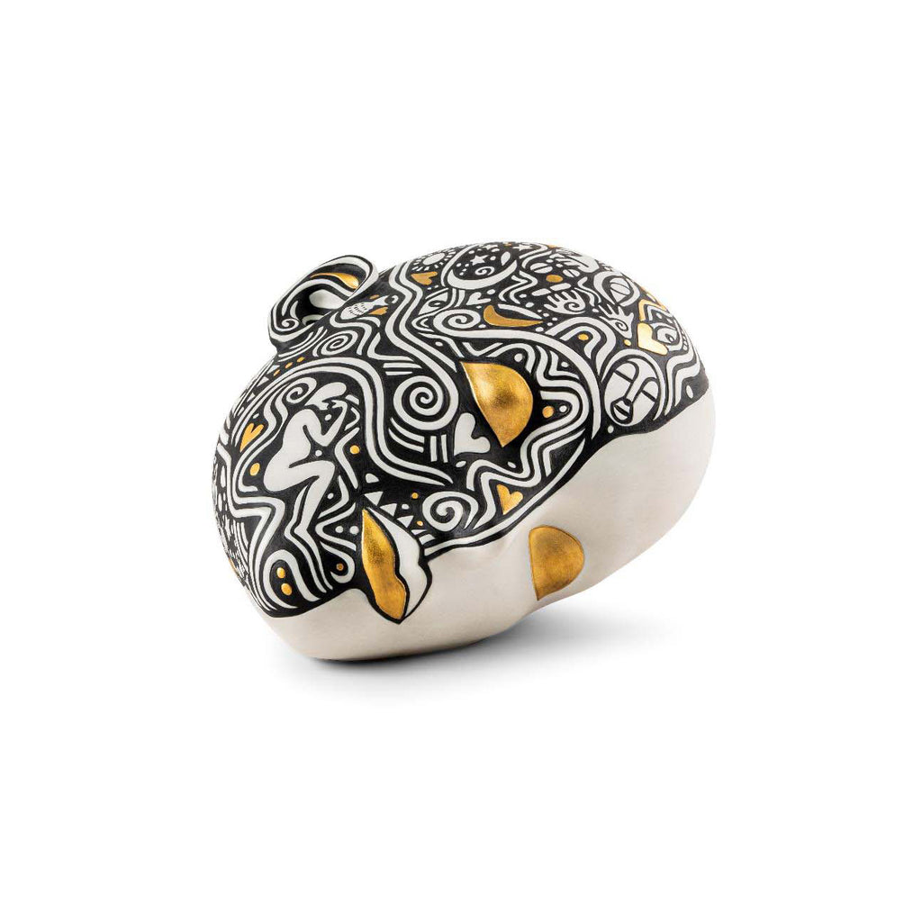 The Dreamer is the result of our first collaboration with Laolu Senbanjo, a renowned New York-based Nigerian artist. Senbanjo’s work, which combines influences from the Yoruba culture from Nigeria with a more contemporary treatment, is expressed here in porcelain with two creations that capture to perfection the codes of his creative world. Comprising a head and a bust, The Dreamer by Laolu plays with the artist’s signature geometric patterns in black and gold on white porcelain. Rendering Senbanjo’s drawing in porcelain called for outstanding work in two main areas. On one hand, the ornamentation team had to etch each one of the strokes by hand so that they could be recreated in the pieces. On the other, it required the expert hands of the decoration team to carefully paint them in black and golden luster. Laolu Senbanjo, also known as “Laolu NYC,” is a Nigerian bred, Brooklyn based visual artist, musician, human rights lawyer and activist. Here, his unique graphic language is coupled with the sculptural form to give rise to a singular work with the personal stamp of a committed artist.