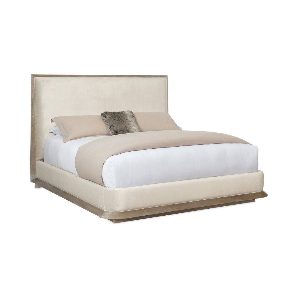 A statement of elegant simplicity, The Stage Is Set King Bed from Caracole is designed to be a beautiful foundation for a luxurious bedroom. This impressive bed features a tall, upholstered headboard, tailored to perfection in a stunning neutral performance fabric and outlined with a sophisticated wood trim. The easygoing Ash Driftwood finish highlights the natural wood grain of the trim and the contemporary platform base. Classic in every way, this bed offers timeless appeal and the versatility to be dressed up or down whenever the mood strikes.
