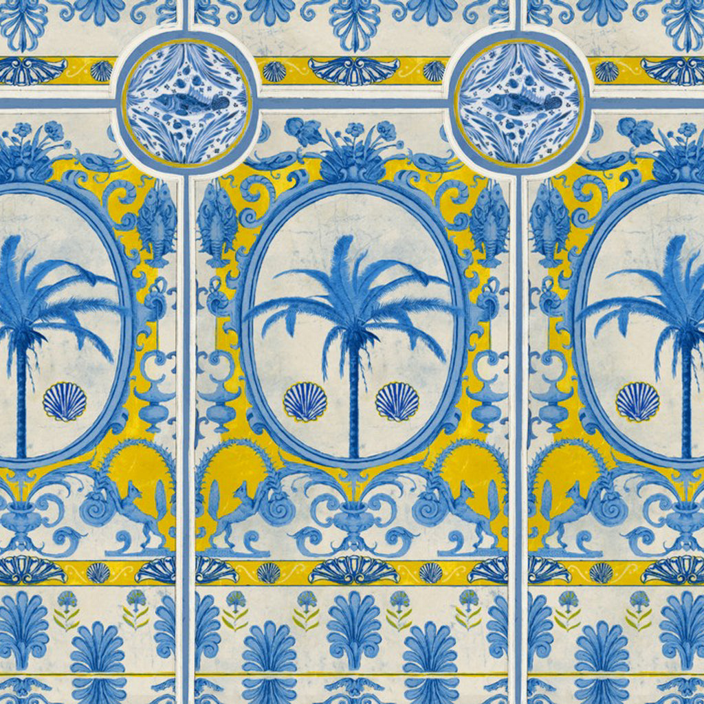True expression of a marvelous Greek villa, this sophisticated mural design is a statement work of art. Fabulous Hellenic ornaments and motifs are combined in a hand-painted large design showing seaside inspired elements in a bold wallpaper design that reminds of an ancient palace wall.