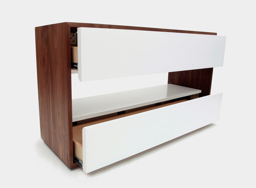 ARTLESS THN pieces expand the minimalist language they find at the heart of their designs. This new and expanding collection is the unintended marriage between two ARTLESS lines. The solid Walnut of the SQ Family and the contrasting lacquered elements of the Units. In the case of the THN, the solid Walnut becomes a protective box enveloping two smaller lacquered drawer boxes. The lacquered boxes are proportioned to be two thirds of the piece. With this move the functionality and mass of the drawers is exacerbated with the visual appeal of an open, see-through space. THN stands for “The Hawks Nest” a name chosen by one of their earliest and greatest supporters, and a very dear client.