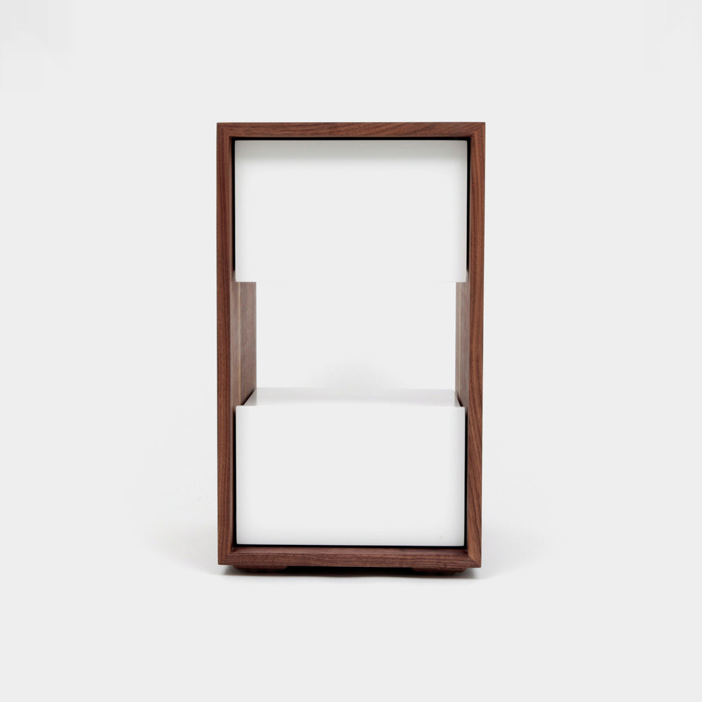 ARTLESS THN pieces expand the minimalist language they find at the heart of their designs. This new and expanding collection is the unintended marriage between two ARTLESS lines. The solid Walnut of the SQ Family and the contrasting lacquered elements of the Units. In the case of the THN, the solid Walnut becomes a protective box enveloping two smaller lacquered drawer boxes. The lacquered boxes are proportioned to be two thirds of the piece. With this move the functionality and mass of the drawers is exacerbated with the visual appeal of an open, see-through space. THN stands for “The Hawks Nest” a name chosen by one of their earliest and greatest supporters, and a very dear client.