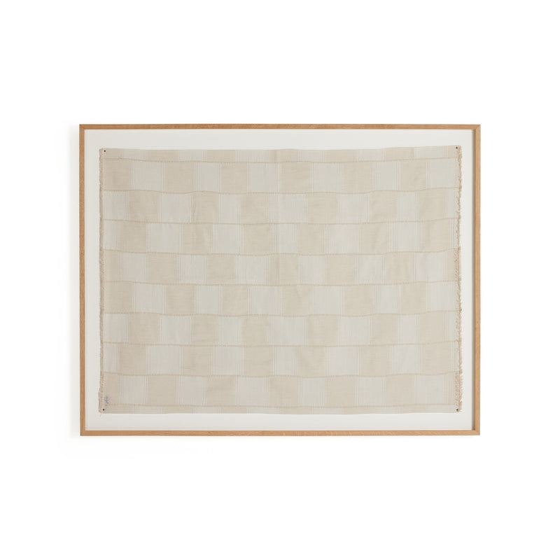 This unique wall art from FH Art Studio features a delicate, tonal woven textile, showcasing soft stitching and a gentle fringed edge. The fabric is mounted with brass pins onto a white backer, all set within a vertical grain white oak frame for a beautifully layered and textural look. Handmade in Austin, Texas.