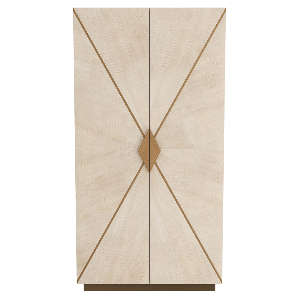 Large-scale tidwell cabinet is both graphic and elegant, existing harmoniously with traditional and contemporary environments alike. Crafted in smoke oak veneer in a radial pattern, the tall storage piece features antique-brass iron inlays, which form a strong geometric point to highlight textured, diamond-shaped hardware, also in an antique brass finish. The cabinet’s interior is fitted with adjustable shelving and a drawer with matching hardware. Finish will vary.