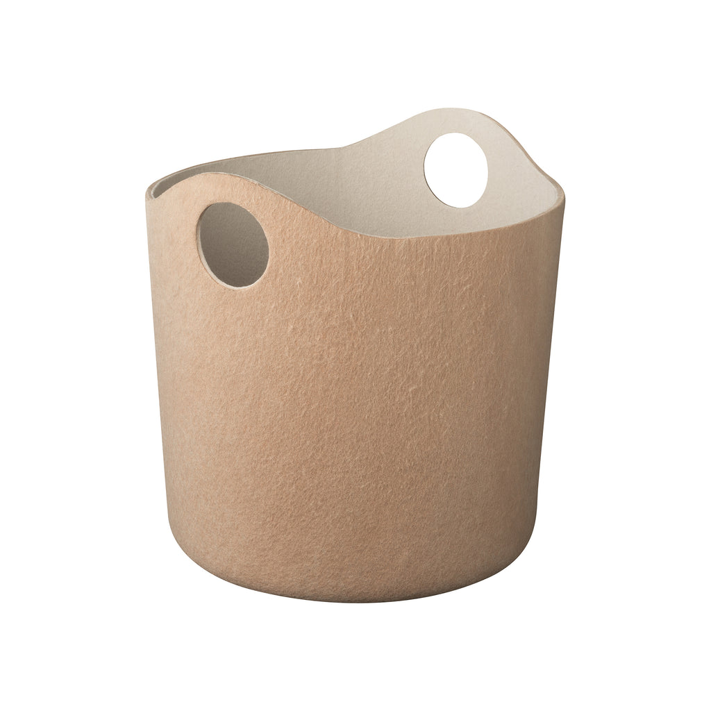 Blomus TIGGY Felt Basket With Handles is a versatile storage basket. The beauty and softness of this design can function as a waste paper basket in the office, for blanket storage in the living room, or even toy storage in a child's room. Made of soft felt, the baskets are available in multiple sizes and feature handle cutouts for easy carrying.