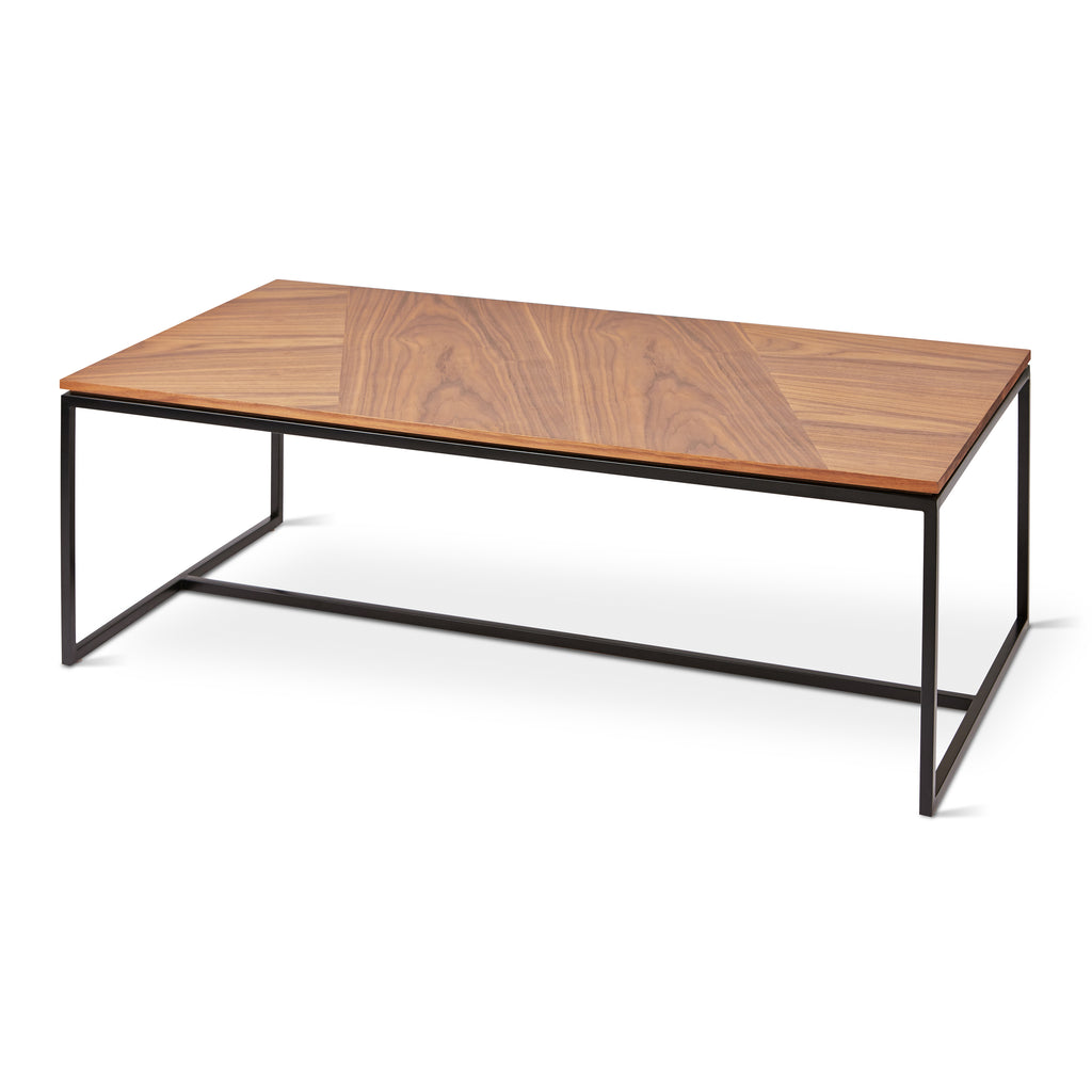 The Tobias Coffee Table is a minimalist, geometric accent piece well suited for modern spaces. The rectangular top features a dynamic arrangement of walnut wood grain panels, which rest on a slim, solid steel base. A subtle reveal along the table edge creates the illusion of a floating top.