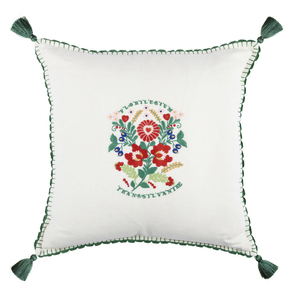 Powerful and elegant, the flowery statement embroidery of this cushion is depicting a beautiful botanical crest design. Decorated with an embroidered M letter monogram on the back and hand-finished with green scallop crochet trimming and green tassels. Coming with 100% duck feathers filling.
