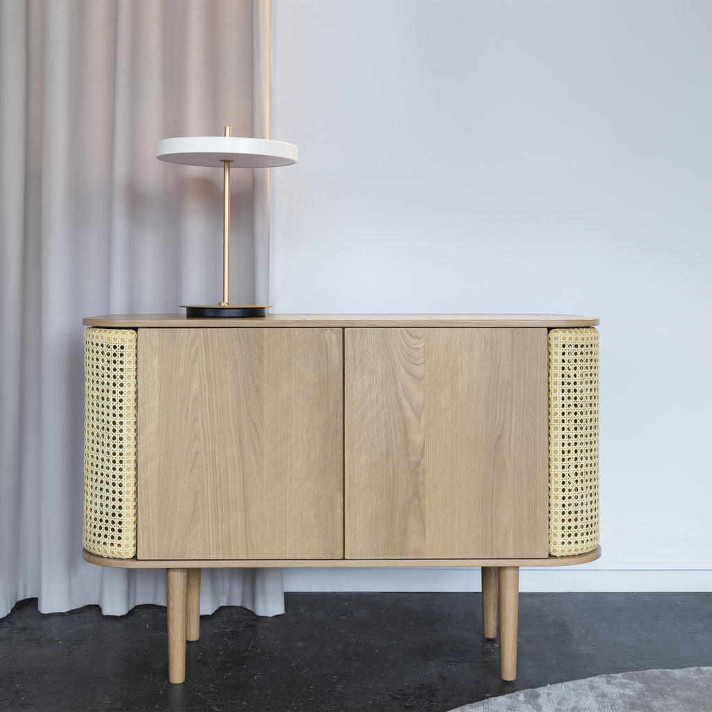 Treasures is a versatile cabinet made from veneered oak, with customizable curved side doors which open as wings, elegantly storing your fine liquor or books. The storage compartments in the center of the cabinet contain shelves perfect for your ceramics and porcelain.