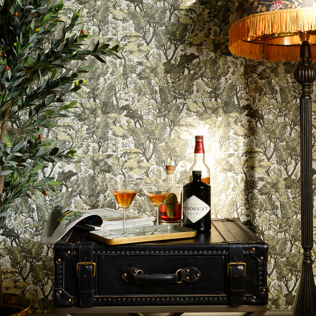 A soft toned design with delicate tree foliage hand drawn illustration creating a botanical light wallpaper. A perfect addition to our more sophisticated floral designs part of The Royal Garden collection.