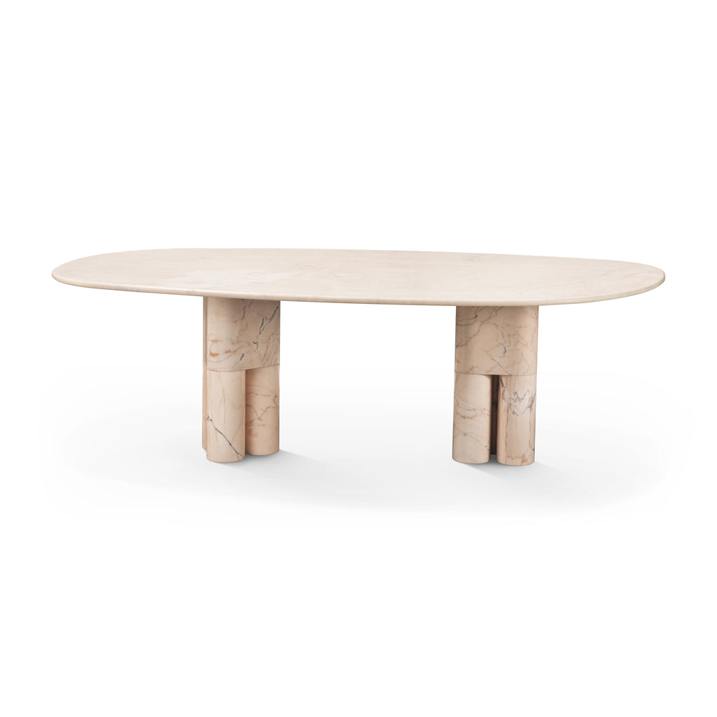 Elevate your dining experience with the Tria Dining Table. Made with Pink Portugal marble, this refined and contemporary table exudes opulence and celebrates nature with its zoomorphic-inspired legs and irregular shape. The delicate pink shades and unrepeatable veins add a feminine touch. Experience luxury and style in every meal.