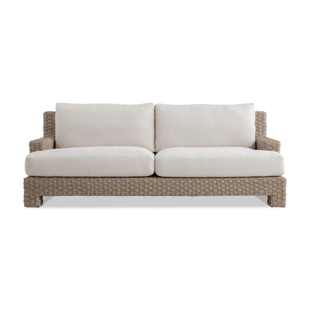 The Trieste Outdoor Sofa from Bernhardt features bold, generous lines and a deep weave in all-weather wicker with a Pampas finish. Its notched seat cushions and back pillows provide exceptional comfort, while the open base introduces a modern geometric style, creating an elevated and sophisticated outdoor seating experience.