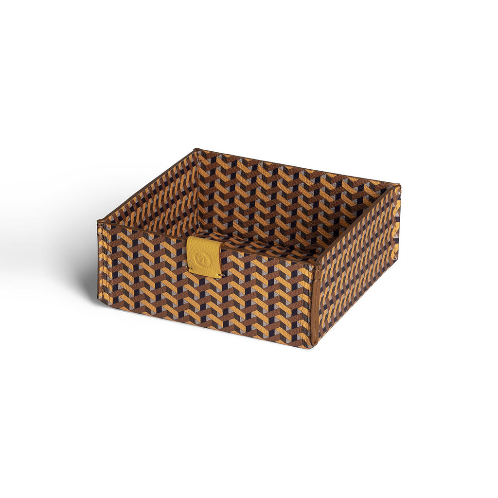Medium: Pelle Frau® Motif Weavers, a digitally printed leather with a geometric pattern that recalls the world of weaving.