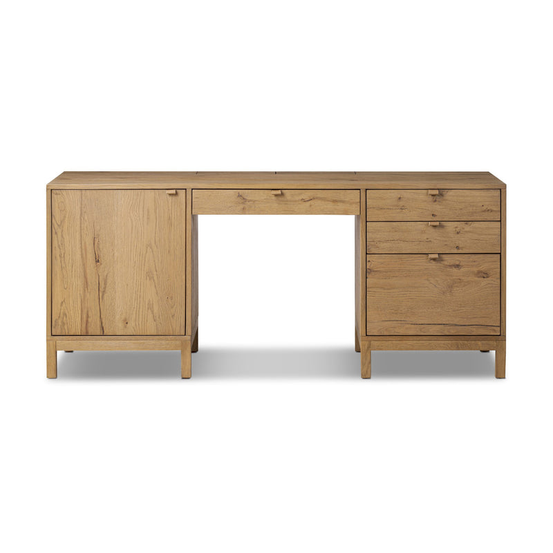 Elevate your home or office workspace with the Tula Executive Desk from Four Hands. This sleek oak desk features a Parsons-style frame, top-grain leather drawer pulls, and ample storage space including drawers, files, and shelves. Plus, with cord management and a hidden outlet, this desk brings ease and style to any modern office.