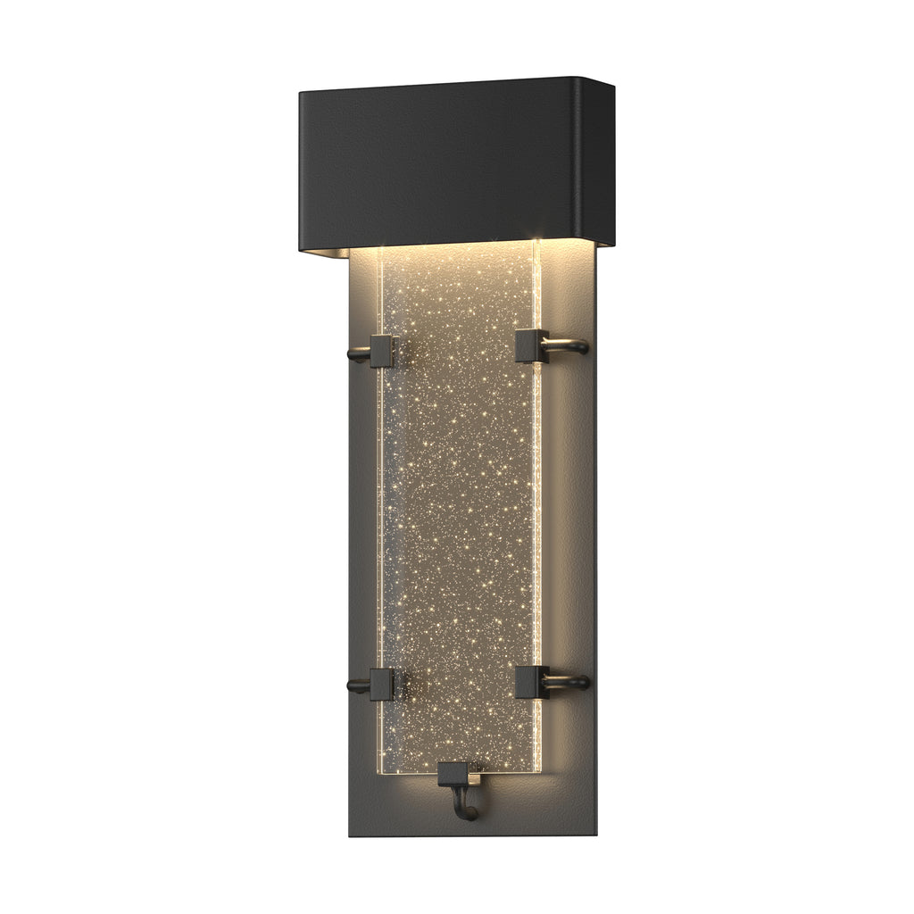 The Ursa features their thick panel of seeded glass that glows like its constellation namesake. The LED source is concealed behind the top metal enclosure, allowing the light to stream through the vertical glass panel below. It looks amazing indoors too.