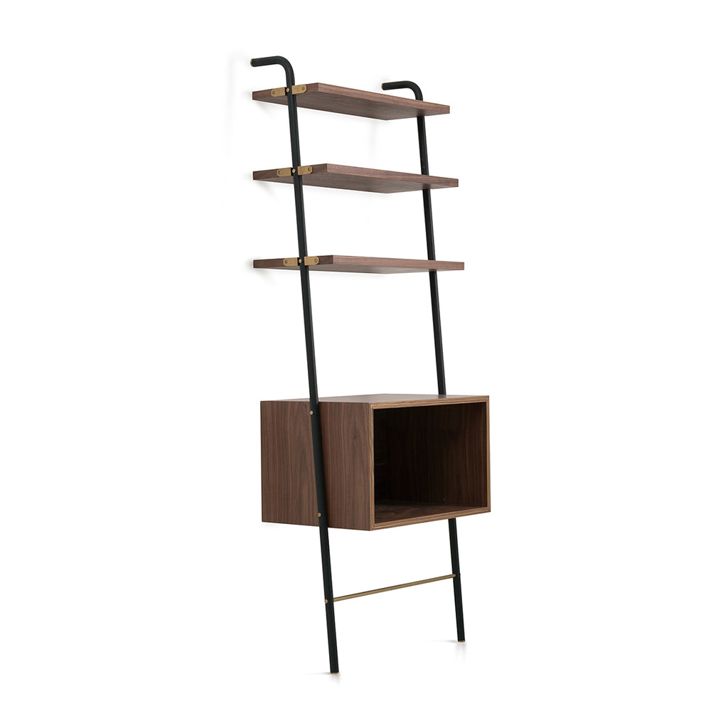 Steel black powder coat sand brust, stainless steel hairline gold, wood veneer shelves.