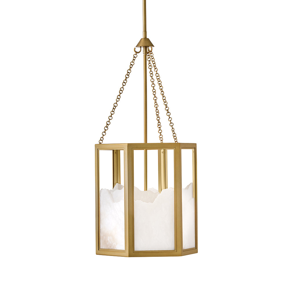 Inspired by Italian design, Valeta’s natural alabaster shade with jagged top edges is showcased by a geometric Lacquered Brass frame. Truly one-of-a-kind graining, color variations, and organically formed textures make each Veleta fixture genuinely unique.