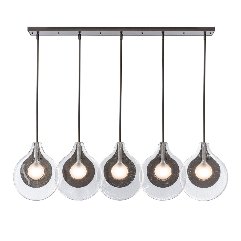 Elevate your space with the stunning, handcrafted Veneto Linear Pendant Light from Hubbardton Forge. The exquisite Venetian glass, textured to perfection, beautifully encases the metal and bulb elements. Designed by Jason Hancock, this pendant boasts five lights for a truly dramatic and surprising experience.