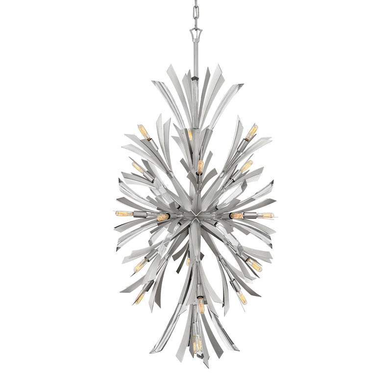 Vida's modern design bursts with a flourishing style that is both highly dramatic and finely sculpted. A statement piece with crystal accents and unique canopy detailing, Vida injects a thrilling dash of contemporary inspiration to its surroundings in a Burnished Gold or Glacial finish.