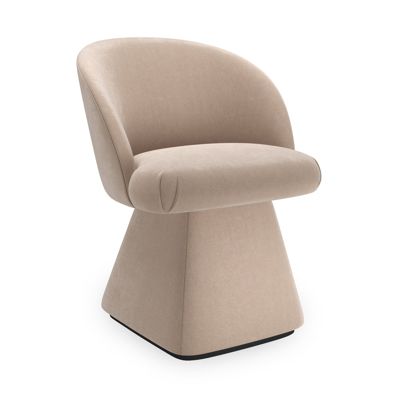 The Vuelta Swivel Chair from Caracole is the epitome of comfort and sophistication. Its light Taupe velvet upholstery, deep cushions, and softly curved back ensure that your dinner guests will be comfortable for hours. The conical base on a black plinth adds a touch of elegance to any dining room.