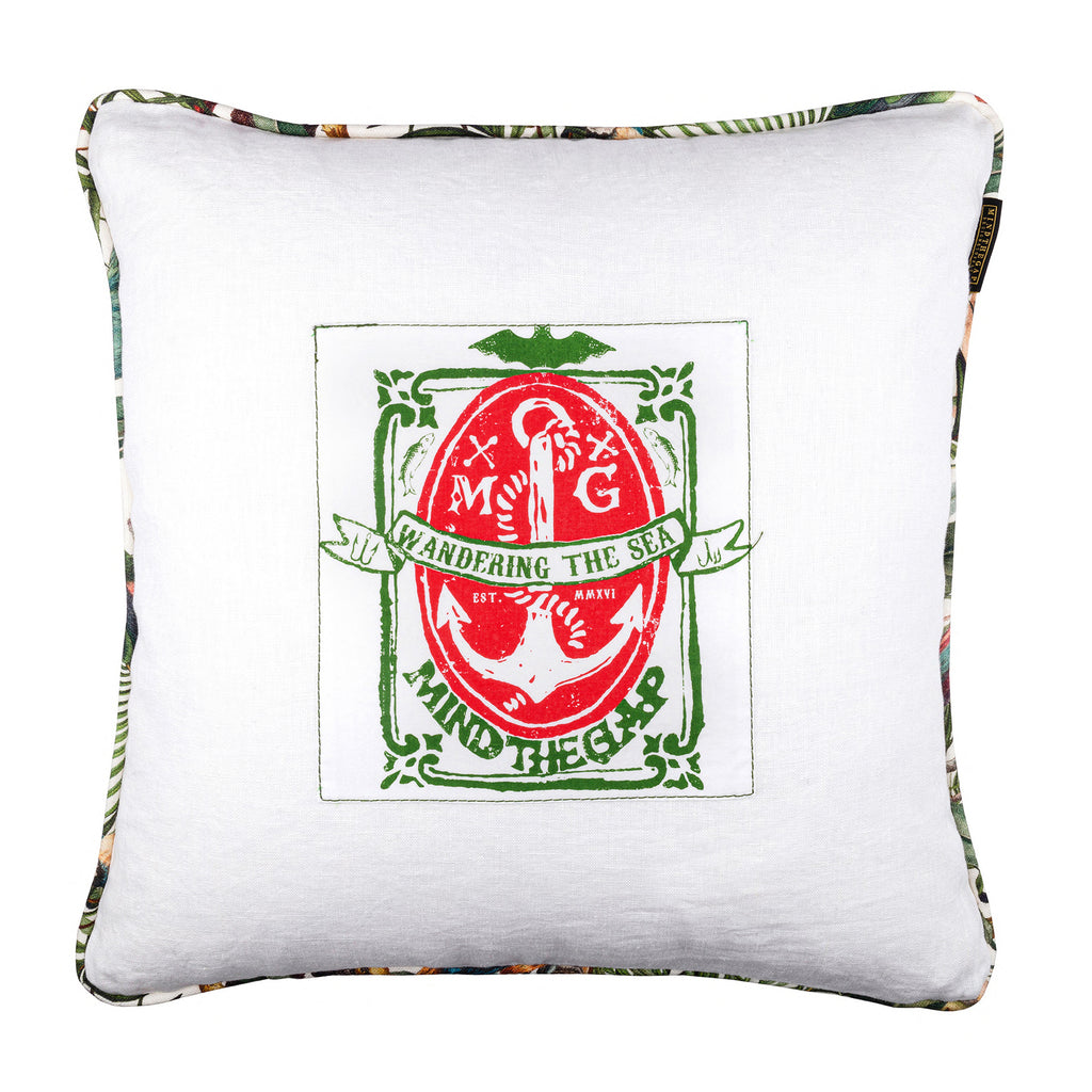 WANDERING THE SEA is a naval inspired cushion showing a beautiful vintage patch on the front side and Birds of Paradise linens fabric on the back side. Finished with assorted piping, the cushion comes with 100% duck feathers filling.