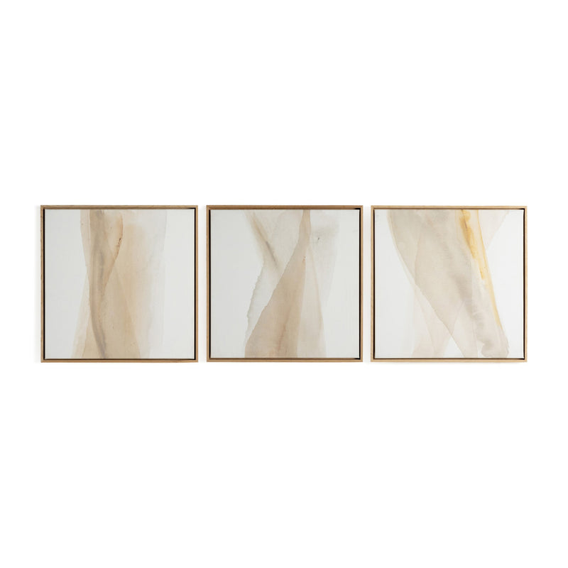 A play on vertical and horizontal lines, this triptych by Austin-based artist Jess Engle features swaths of neutral hues that evoke the image of a breeze through the trees. Printed on matte canvas, the set is complemented by vertical grain white oak floater frames. Handmade in Austin, Texas.