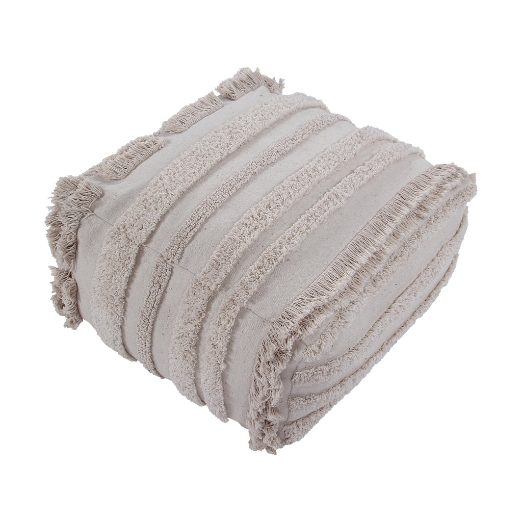 Pouf with canvas base in Natural color, and rows different textures. Cover is removable with a zipper, and inside cushion is filled with small balls of poliestireno.
