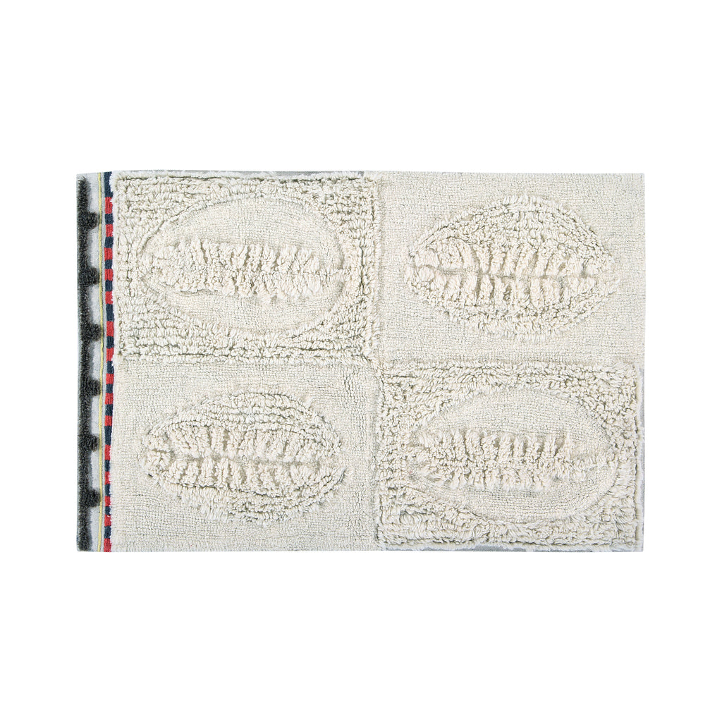 Rectangular wool rug made in natural wool color, using positive and negative effects creating a geometric pattern of silhouettes of cowrie shells throughout the rug, playing with different pile heights. At one of the borders, the rug is finished with visible canvas base decorated with embroidery in Charcoal, Sunlight and Arabesque, and finished with a short pile stitch line in Almond Frost color.