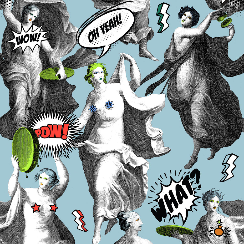 A witty design, on a light blue or pink background, which satirize objects in a pop art style. Pop Art transforms the ordinary into the extraordinary so this wallpaper will spice up any environment.