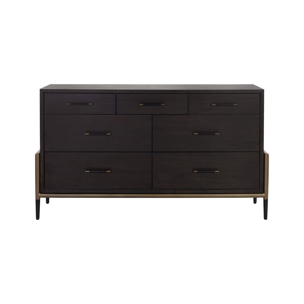 Keep your bedroom clean and clutter-free with the Weldrick Dresser from Sunpan. Crafted from exquisite espresso or oyster acacia wood veneer, this luxurious piece boasts seven soft closing drawers adorned with black and antique brass iron handles. Each dresser is unique with natural imperfections that add to its stunning character, ready to create a resort-worthy sleep space with ease.