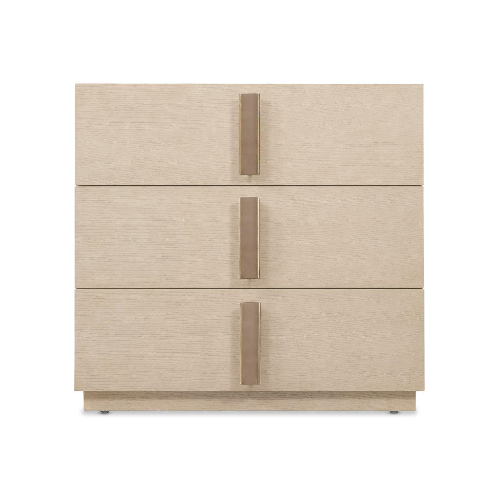 Indulge in the modern elegance of our Westwood Three-Drawer Nightstand from Hooker Furniture. Made with quartered oak veneers and a Polished Limestone finish, it features three spacious drawers, including cedar-lined bottom drawers for added luxury. The custom bar hardware in a plated Radiance finish adds contemporary flair while the integrated charging station with USB ports offers convenience. Perfect for any bedroom.