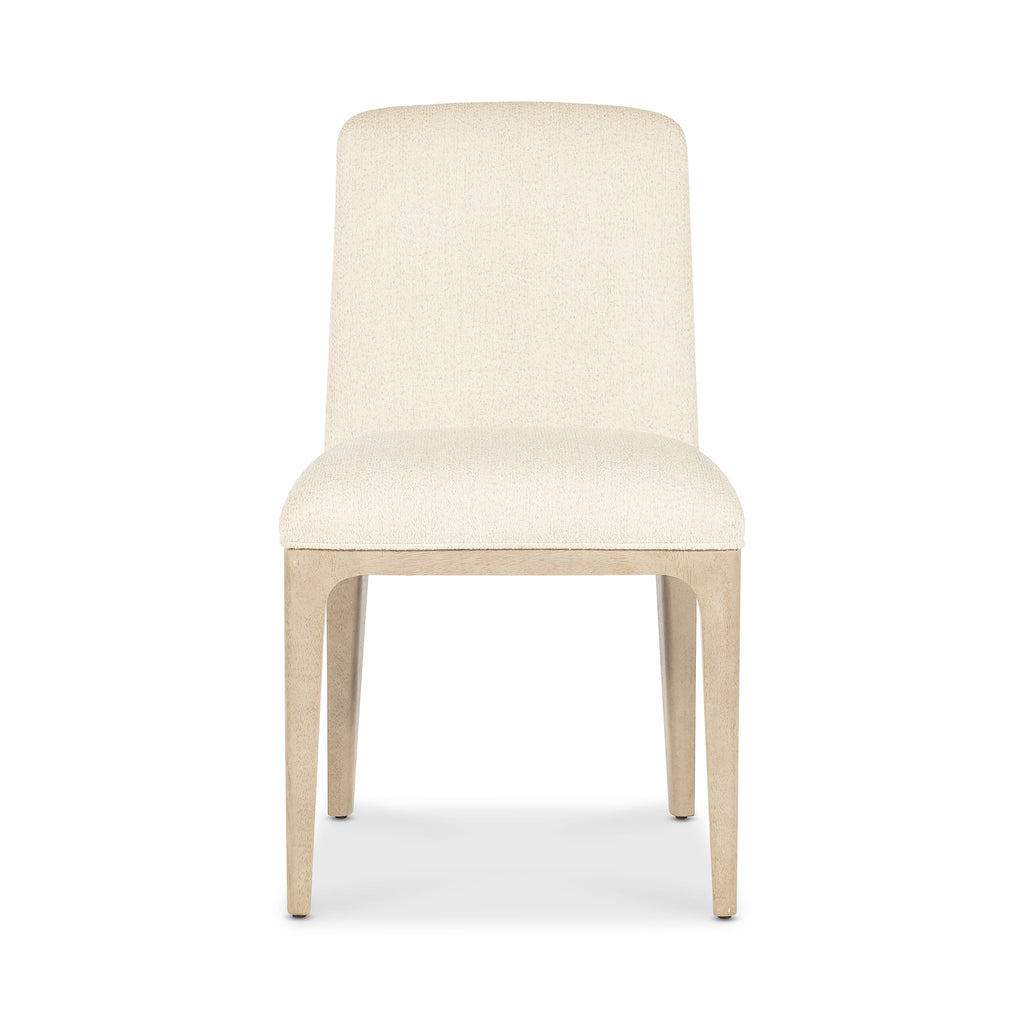 Enhance your dining experience with the refined elegance of the Westwood Upholstered Side Chair from Hooker Furniture. Crafted with fully upholstered performance fabric for lasting comfort and style. The Polished Limestone finish on quartered oak veneers and wood base lend a sophisticated touch to the modern silhouette. Perfect for those who value luxury and timeless design.