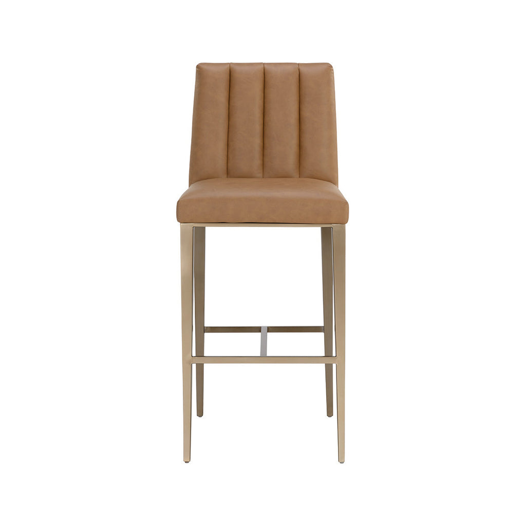 With its minimal form and classic details, the Wilbur Barstool from Sunpan is a sophisticated seating solution. The comfortable seat is upholstered, with vertical channeling on the backrest for a touch of textural flair. The design rests on a slender stainless steel frame, finished in a warm antique brass. A matching decorative handle on the back adds a final, thoughtful touch, blending style with function. A refined and comfortable choice for any modern kitchen island or bar area.