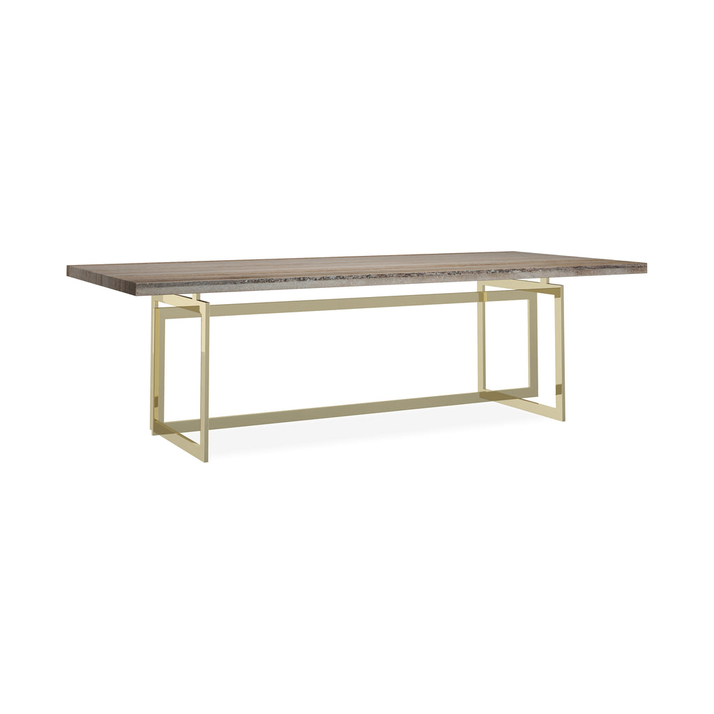 An extraordinary example of organic luxury, the Wish You Were Here Dining Table from Caracole is designed to be an ultra-impressive centerpiece. This stunning table is defined by its substantial, 100-inch tabletop, crafted from beautiful gray sandstone where earthy tones meld with greiges and soft grays. The natural, warm feel of the stone top is beautifully contrasted by a bold, open geometric base, finished in a shimmering Whisper of Gold for a touch of contemporary glamour. A fusion of organic materials and striking geometry, it’s a sophisticated and unforgettable stage for any dining occasion.
