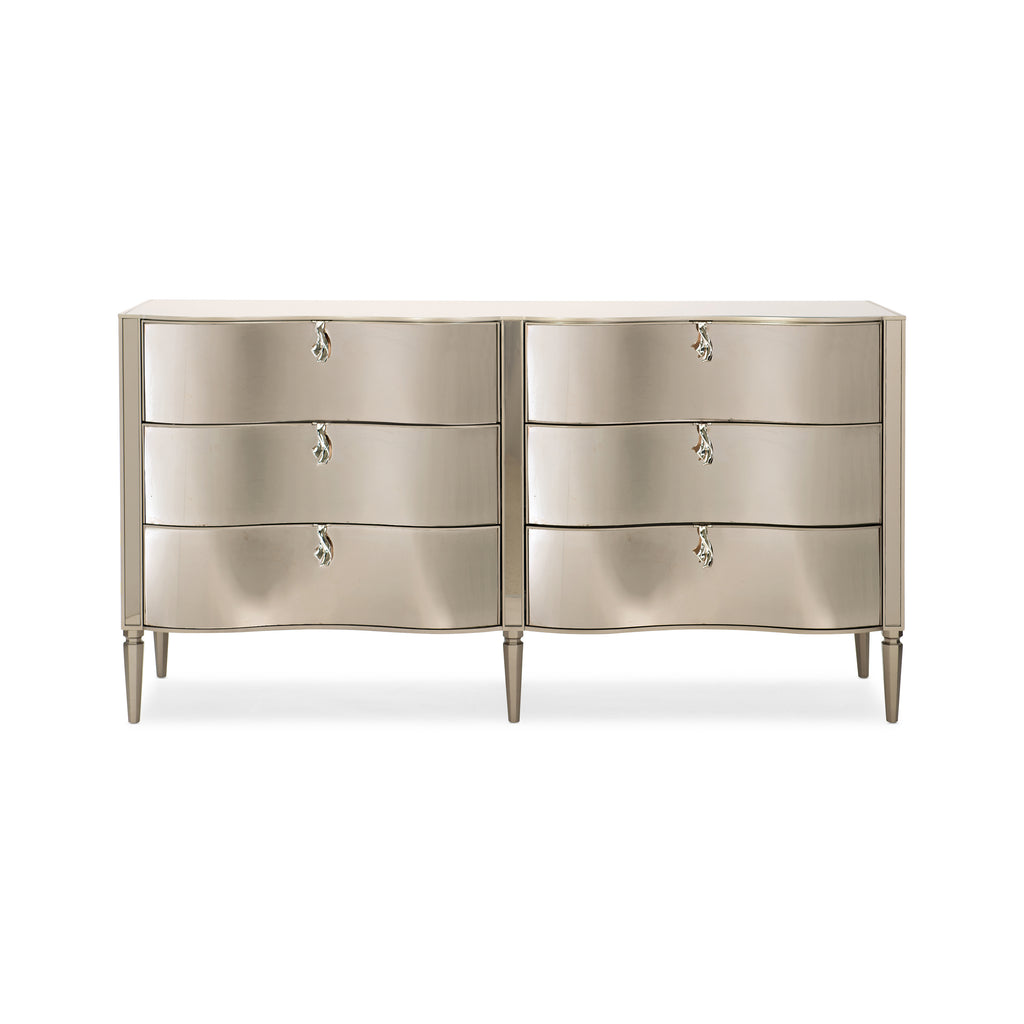 A statement of dazzling glamour, the Wonder-full 6-Drawer Dresser from Caracole is a designer favorite for its shapely curves and rich mix of materials. This beautiful dresser is defined by its sophisticated Golden Shimmer finish, which is beautifully complemented by a bronze mirrored top, end panels, and post overlays. Six spacious drawers offer ample storage, while dazzling, jewelry-like drawer pulls and gracefully shaped legs add a final element of unexpected beauty. A fusion of classic and modern influences, it's a stunning and unforgettable centerpiece for any luxurious bedroom.
