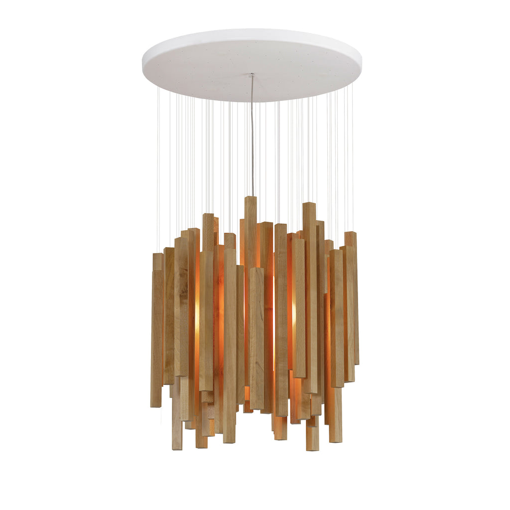 Designed by Hector Serrano, this pendant lamp made with suspended wood pieces, reproduces the magic of a forest when light flows among its trees. A harmonious group of vertical lines at different heights that produce an enveloping game of lights and shadows. The naturalness of the wood confers this lamp, of restrained lines, elegance and warmth, looking as if it was waiting for the wind in a calm stillness.