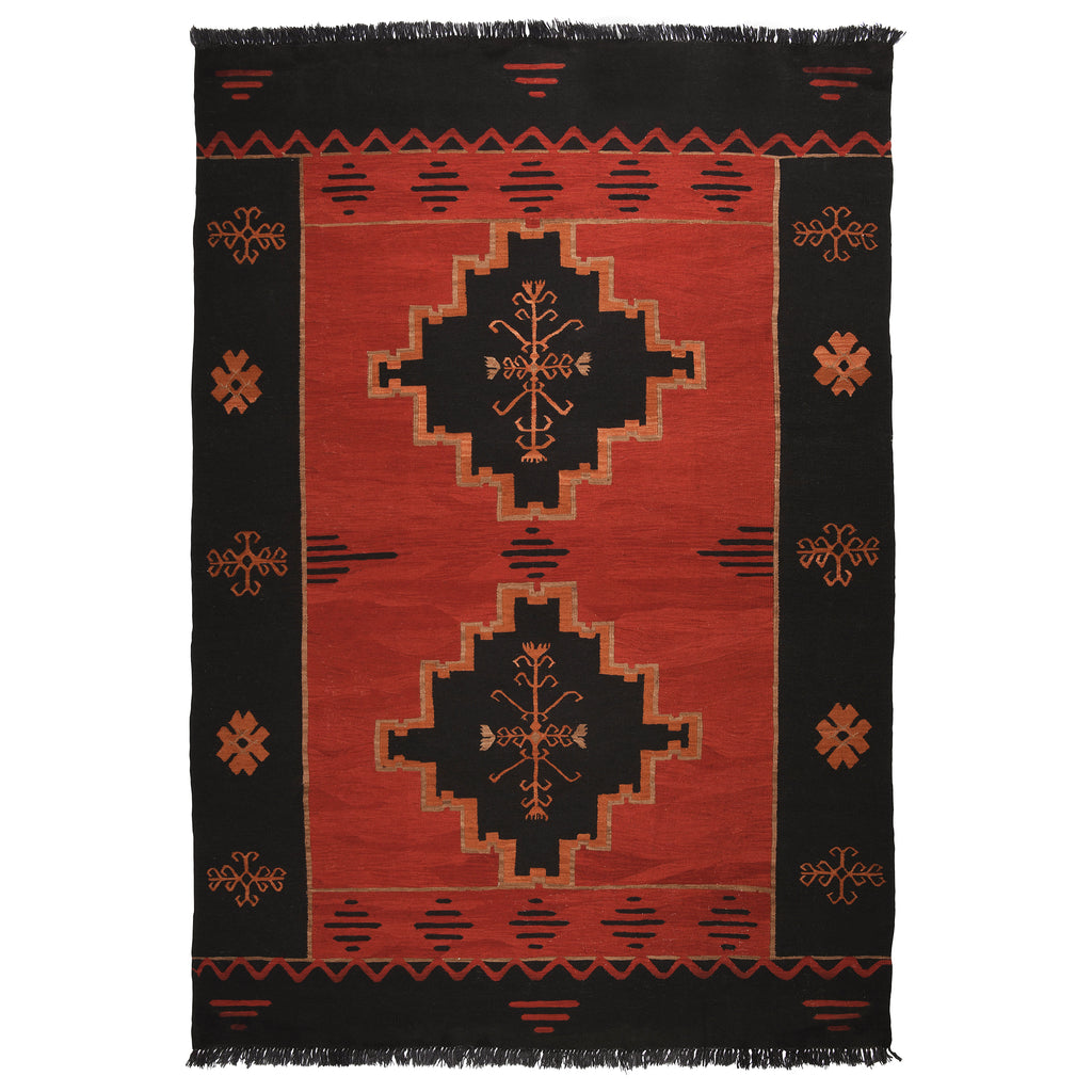 Hand-knotted from pure wool and colored with natural vegetable dyes, this Turkish kilim brings orange and red hues together to create a vibrant statement. With ornate motifs and geometric forms decorating the piece, this flat-woven, reversible rug is complemented with black fringing to both ends. This striking design brings and joy and vivacity to any interior.