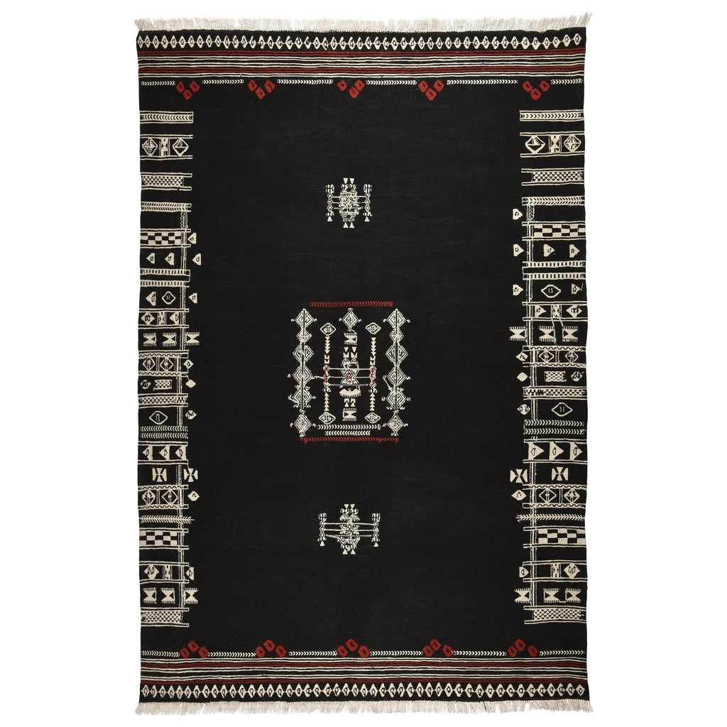 Hand-knotted from pure wool and colored with natural vegetable dyes, this Turkish kilim features intricate geometric patterns which decorate the borders of the rug around a central motif. With touches of red to complement the monochrome palette, the flat-woven, reversible rug is finished with white fringing to both ends. A statement design which brings a charm to any home.