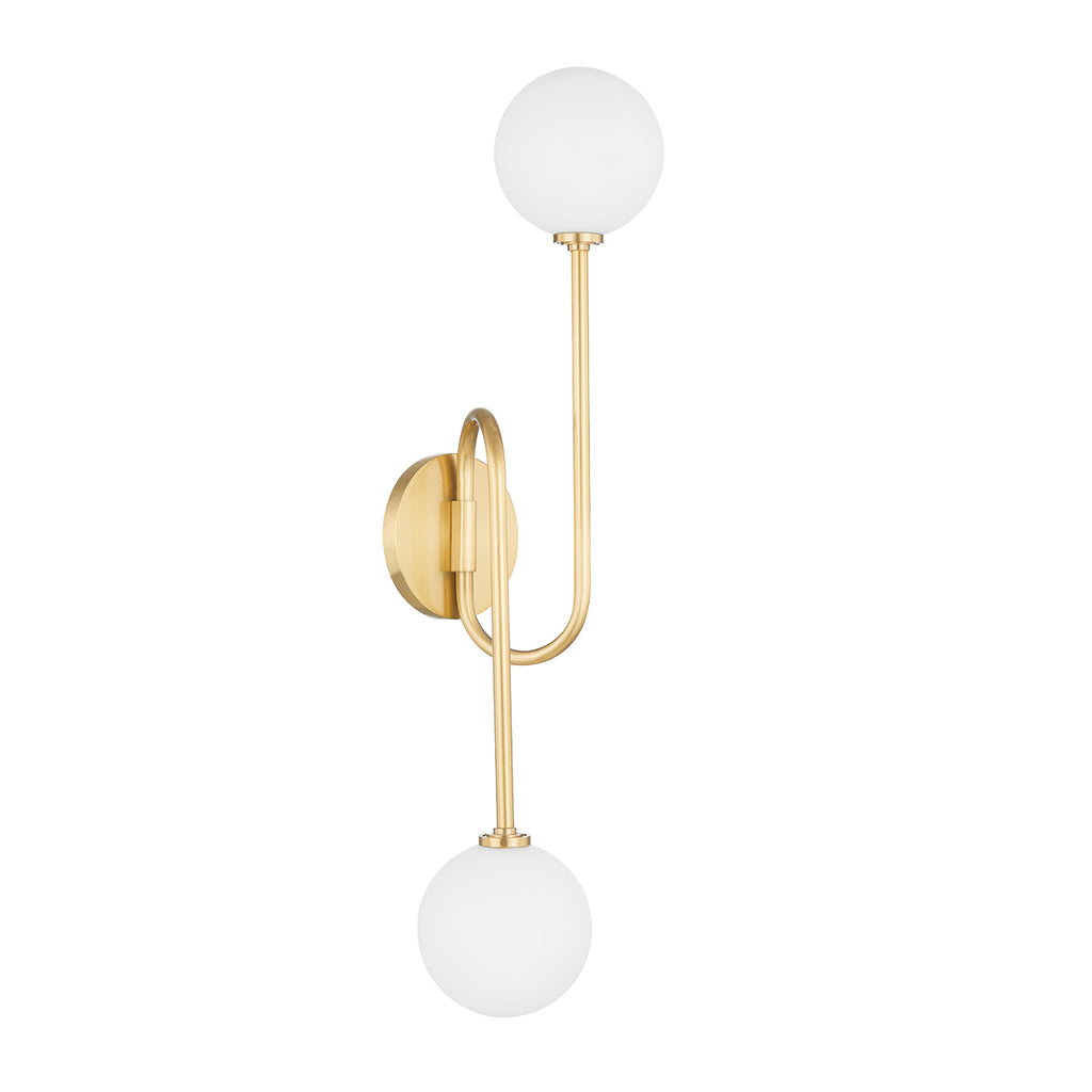 Indulge in the timeless elegance of the Zani Wall Sconce from Mitzi by Hudson Valley. Inspired by 1940s industrialism and with a nod to urban subway maps, this classic globe sconce boasts a unique twist. Its curved arms flow gracefully from a circular backplate, allowing light to radiate in both directions. Choose between clear glass bulbs for a bright, crisp ambiance or opal glass for a more refined touch. Elevate your space with this fluid and sophisticated piece.