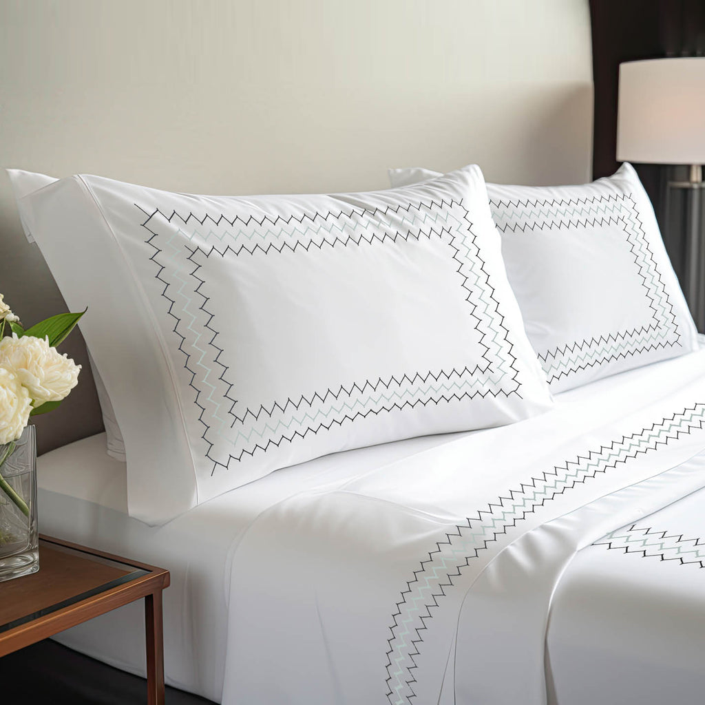 Elevate your bedding with the Zig Zag Sham from The Lino, marrying modern geometry with a chic finish. Featuring bold zigzag embroidery and a refined 400-thread count percale weave, this 100% Egyptian cotton sham offers a crisp and sumptuously soft touch. Add a touch of sophistication to your bedroom with this luxurious design.