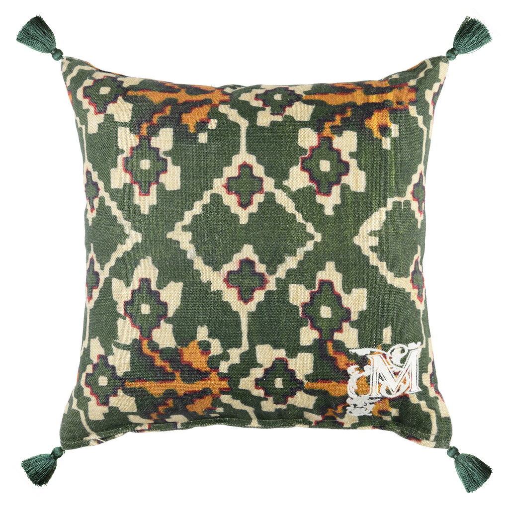 Front and back printed ZOLD linen, green monogram embroidered on the back, green tassels on each corner, 100% duck feathers filing.
