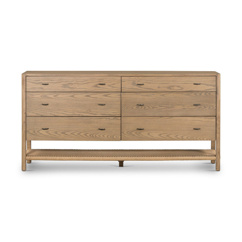 Elevate your bedroom with the Zuma 6-Drawer Dresser from Four Hands. Crafted with solid ash and sleek gunmetal hardware, this Danish-inspired dresser adds refinement to any space. The unique stretcher-style shelving, made from woven paper cord, offers a tactile touch. With six spacious drawers, enjoy generous storage space in a simple and stylish design.
